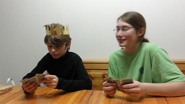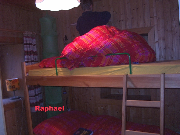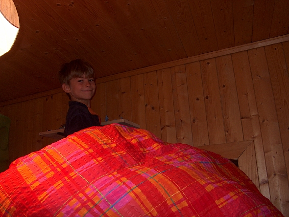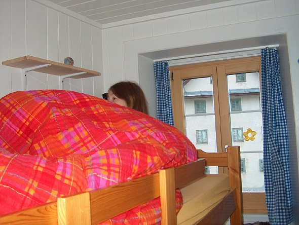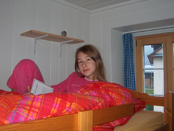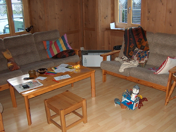 Spiele, Mal- und Strickzeug im Stubenbuffet, Bettsofa mit Anleitung.